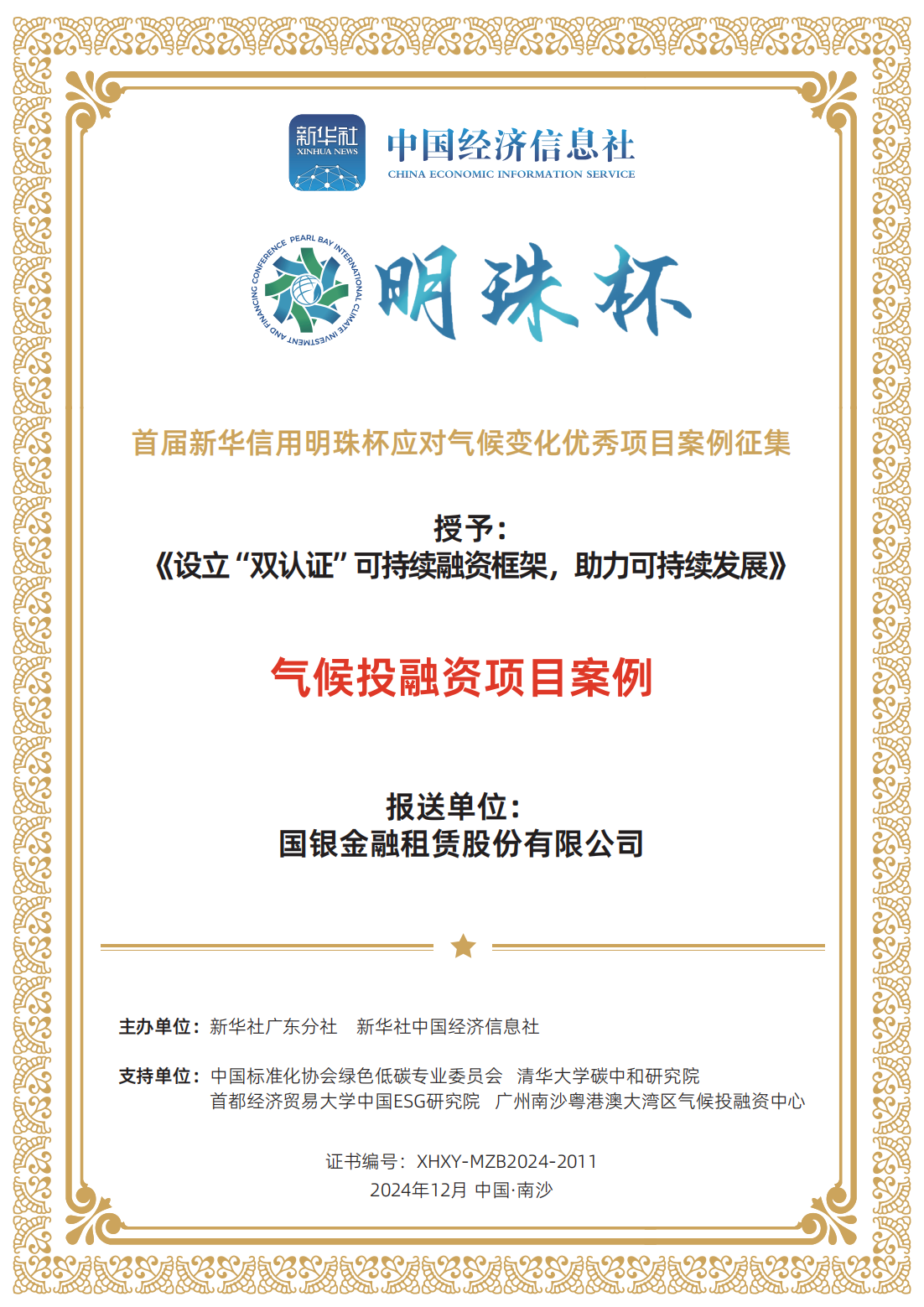 在2024年明珠湾国际气候投融资大会现场,新华信用明珠杯·应对气候变化优秀项目名单揭晓,国银金租报送的《设立“双认证”可持续融资框架,助力可持续发展》案例荣获气候投融资优秀项目案例。