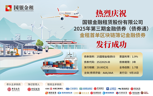 9月16日,国银金租于全国银行间债券市场成功发行金融租赁行业首单区块链簿记金融债券(债券简称:25国银金租债03;债券代码:2522029.IB)。本期债券发行规模20亿元,期限3年,票面利率1.90%。